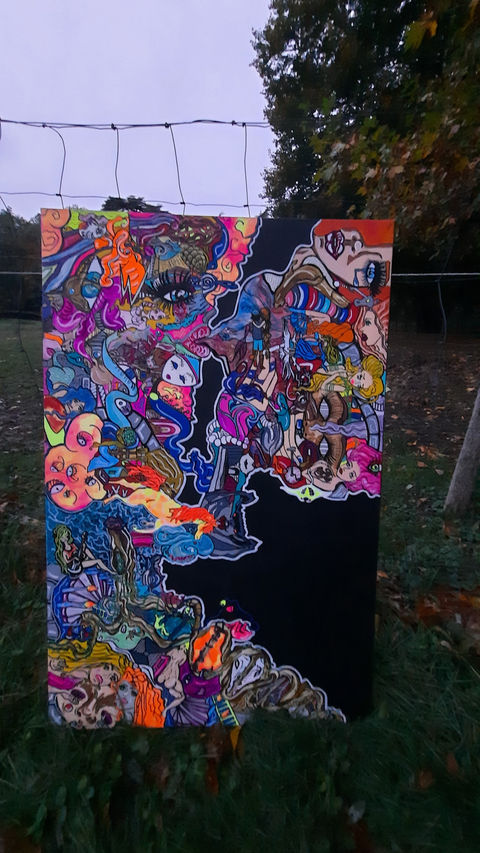 My techniques and supports are mixed. Most of the time I use canvases on which I practice collage, colored bombs application, the use of different painting medium (acrylic, gouache, ink, oil, and/or watercolor). I start preliminary with drawings and sketches to carry out my research, which I use to carry out the layouts (Search for full and empty spaces) and to create new sequences of shapes. The colors are very often flashy because it is for me a way to represent the essence of revolution and the break with conformism and conservatism. It therefore seemed natural to me to use it in the goal of denouncing and informing from a youth point of view. Revolution, in an ideology of total rejection while shouting out its differences and its discomfort, is flashy for me. The work of accumulation through colors and shapes makes it possible to give real meaning by creating this feeling of being lost and drowned through the many elements and all the information. The spectator is thus lost in the painting and seeks the real meaning of the painting, just as today's youth seeks a meaning in the place they should find for themselves in the society where they seem to have lost their identity.